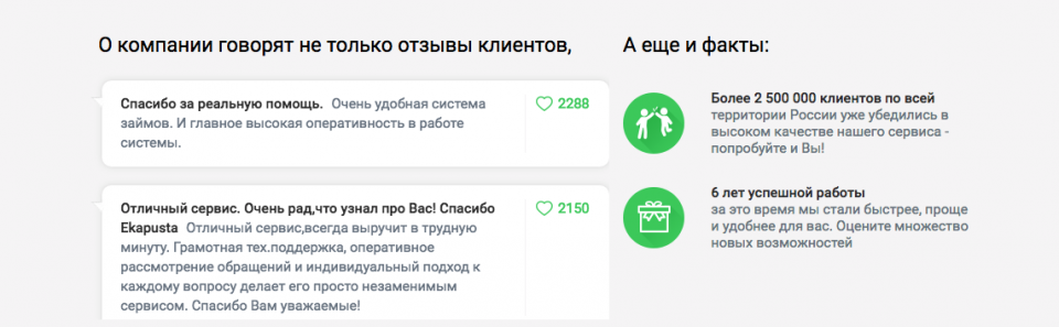 Е-Капуста – предлагает выгодные условия по онлайн займу, пользующиеся популярностью во всех регионах России. Она завоевала доверие более 2000000 клиентов, которые остались довольны качеством и уровнем обслуживания. При необходимости, они обращаются к сервису за очередным займом независимо от времени суток.