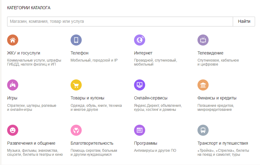 Основные разделы для покупок находятся на money.yandex.ru/shops.xml. Ссылки поделены по группам. Наиболее популярные вкладки расположены верхней части экрана. К ним относятся мобильная связь или платежи за интернет.