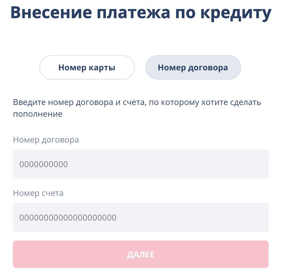 Для пополнения кредитной карты достаточно указать номер карты и дату своего рождения, а для оплаты кредита потребуется ввести номер кредитного договора и номер счета.