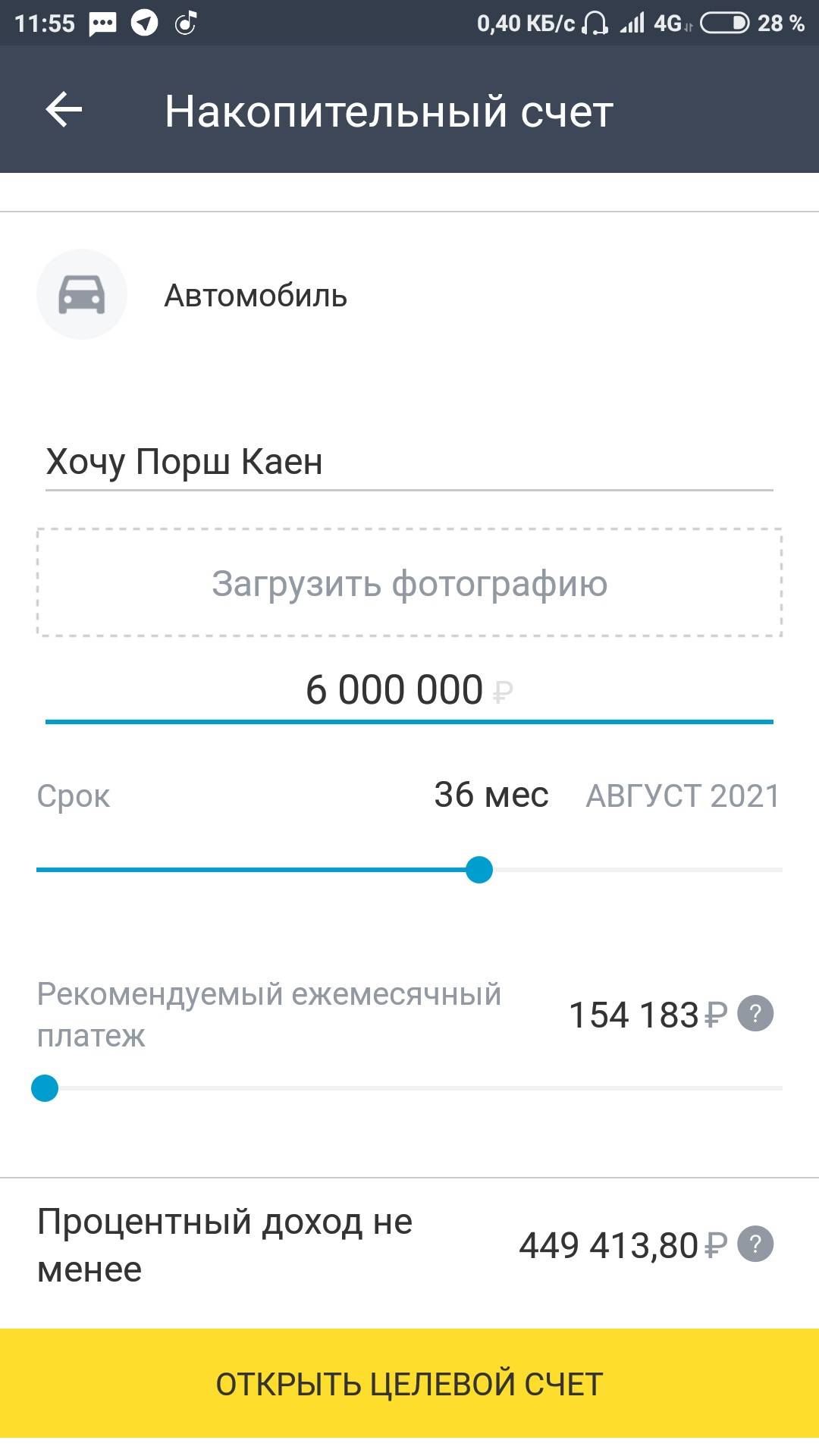 Прямо внутри приложения пользователю доступно меню, открывающее накопительный счет для достижения определенной цели. К примеру, человеку хочется приобрести телефон. Достаточно открыть счет, прописать необходимую сумму и запланированный срок получения, после чего программа самостоятельно подсчитает сумму, которую надо откладывать ежемесячно.