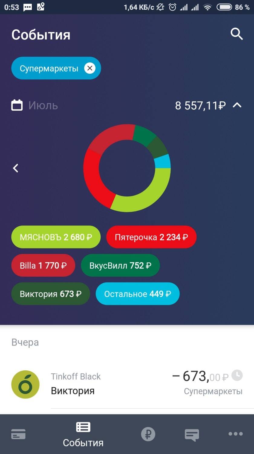 Кроме того, приложение позволяет увидеть сумму кэшбека, который вы сможете заработать на протяжении месяца. Владельцы карты Tinkoff Black получат от одного до тридцати процентов за совершение покупок.