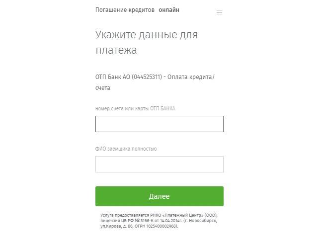 - Ввод реквизитов платежа: номер счет и ФИО клиента ОТП, сумма;