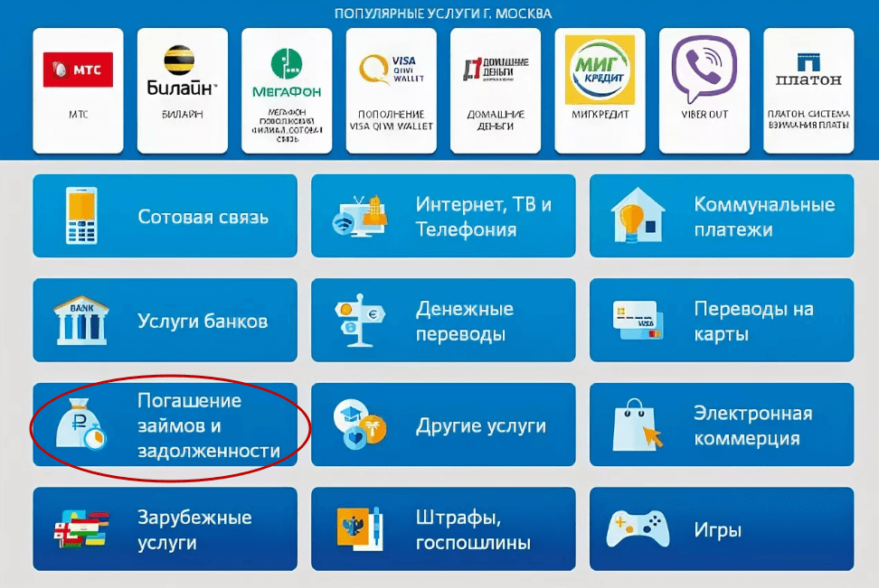 Это один из удобных способов, так как найти терминалы для оплаты можно практически в любом торговом центре или в магазине. На главном экране нужно будет выбрать соответствующий пункт, связанный с банком или с погашением кредита. После этого понадобится выбрать Тинькофф банк.
