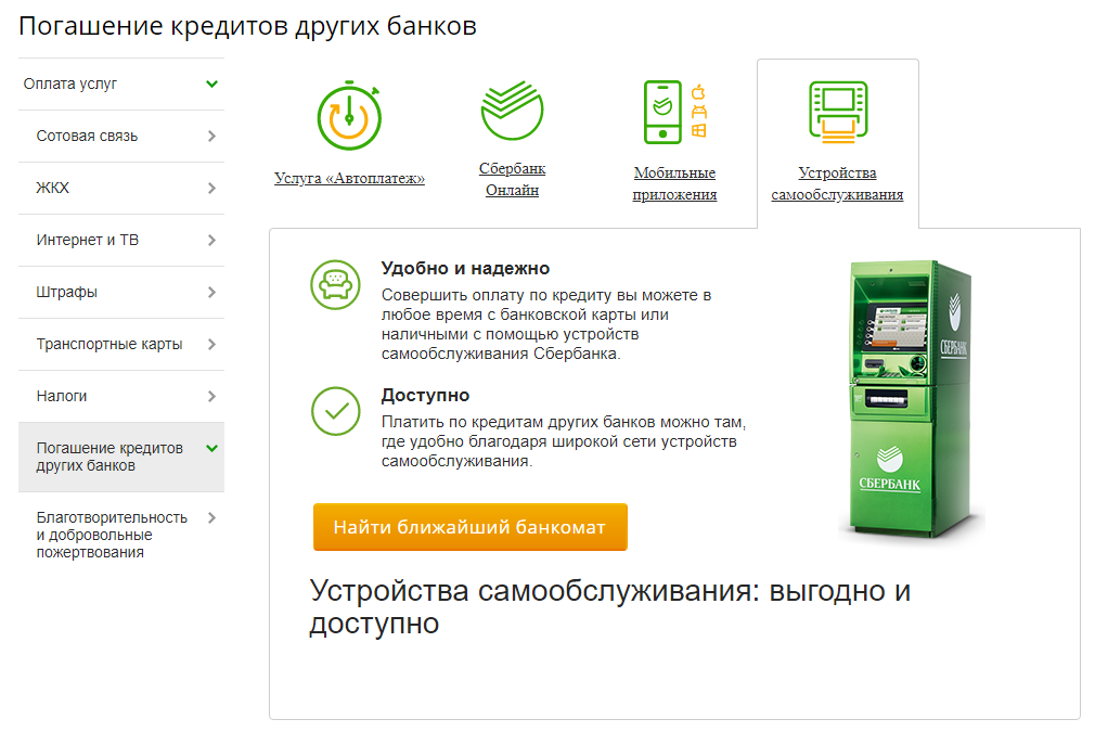 При помощи Сбербанка онлайн можно совершать любые удаленные операции, в том числе, погашать кредиты других банков. Благодаря тому, что интерфейс мобильного Сбербанка прост, он полюбился многим пользователям. Совершать платежи через него просто и удобно, тем более что можно настроить автоплатеж, и не переживать о том, что вы пропустите дату оплаты.