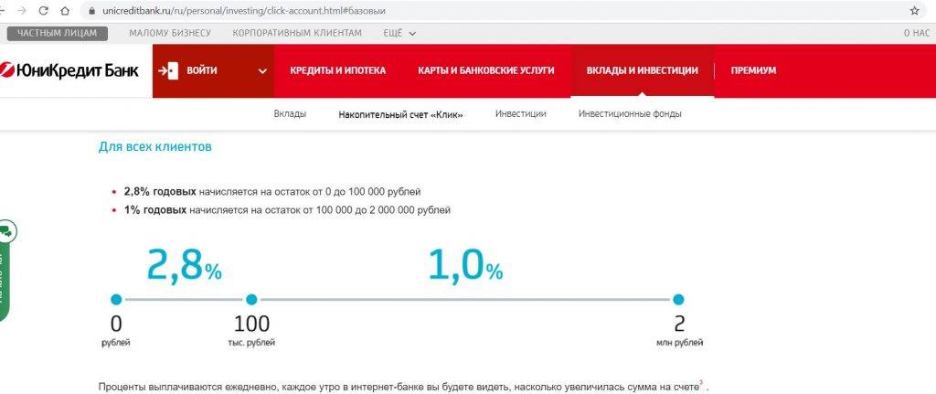 В банке есть накопительный счет «Клик», с начислением процентов на ежедневный остаток, сейчас там на остаток до 100 000 руб. положено 2,8% годовых: