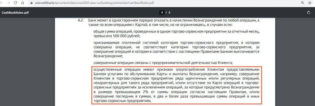 В условиях бонусной программы «ЮниКредит» прописал себе право не начислять кэшбэк, если траты в повышенных категориях («Авто») больше чем в два раза превышают остальные покупки (покупки у партнеров относятся к «остальным» покупкам). Однако пока мне не попадались отзывы, что «Юник» пользуется этим правом на практике.