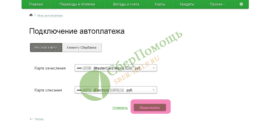 - С помощью услуги «Автоплатеж». Данный способ гарантирует погашение кредита в другом банке через систему Сбербанк Онлайн без задержек и просрочек. За один день перед проведением списания, владельцу карточного счета направляется СМС уведомление о предстоящей операции. Вновь подключившиеся пользователи «Автоплатежа» часто спрашивают, можно ли отменить запланированную процедуру списания? При желании, клиент может отправить ответное СМС сообщение, и платеж будет удален. Подключается «Автоплатеж» самостоятельно в интернет – банкинге или с помощью сотрудника банковского учреждения. Услуга подключается всего один раз, и после этого в обозначенный день автоматически определенная сумма будет погашать кредит стороннего банка. Комиссия за регистрацию услуги не взимается, но на совершенную операцию банк начисляет определенный процент.