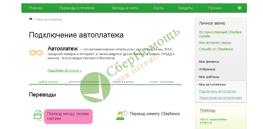 Войдя в личный кабинет Сбербанк Онлайн, переходите в пункт “Мои автоплатежи” в Личном меню справа.