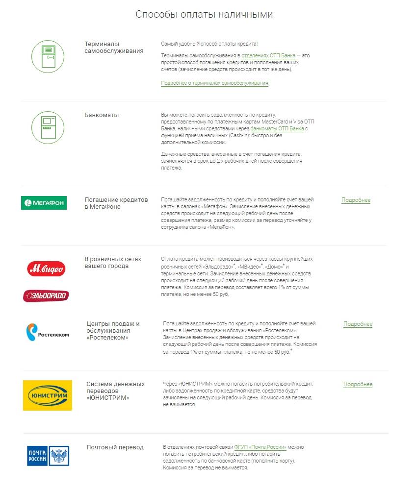 На сайте ОТП Банка для погашения кредита приведены официальные способы на любой вкус.