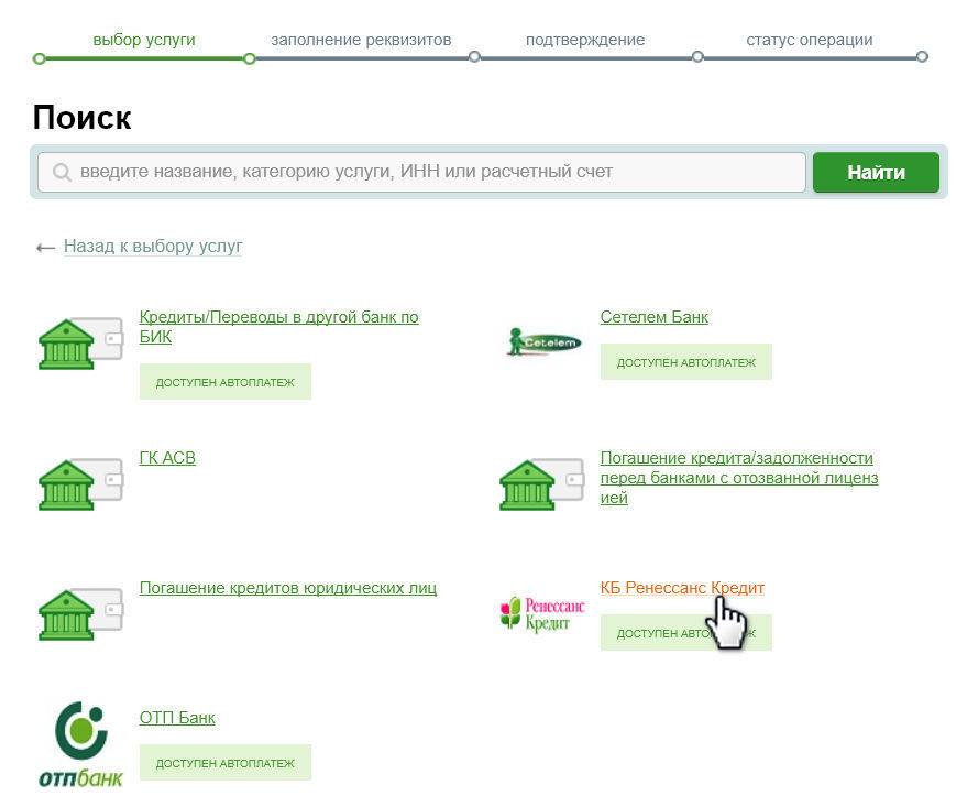 Чтобы оплатить кредит в Ренессанс через Сбербанк, клиент может обратиться к доступным методам: