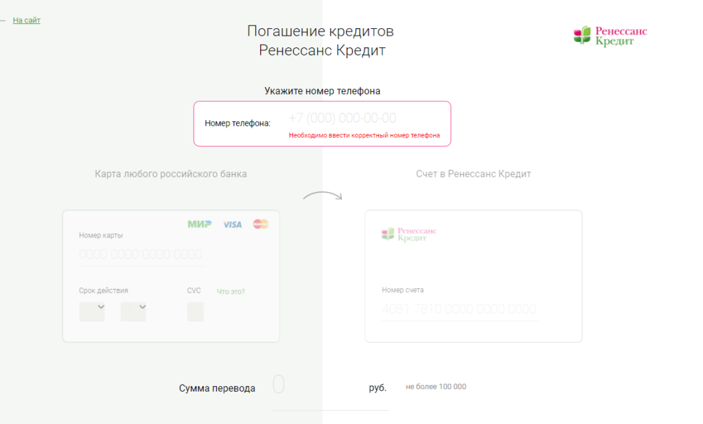- перевод на счета других клиентов «Ренессанс Кредит» по номеру телефона, карты или счета;