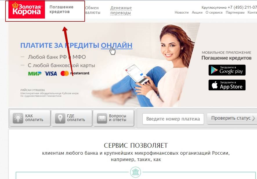 Пункты сервисов системы находятся в отделениях Евросети, МТС, Билайн. Нужно знать номер кредитного договора и предъявить паспорт. Существует также мобильное приложение «Золотой короны», скачав которое, можно задолженность по займу.