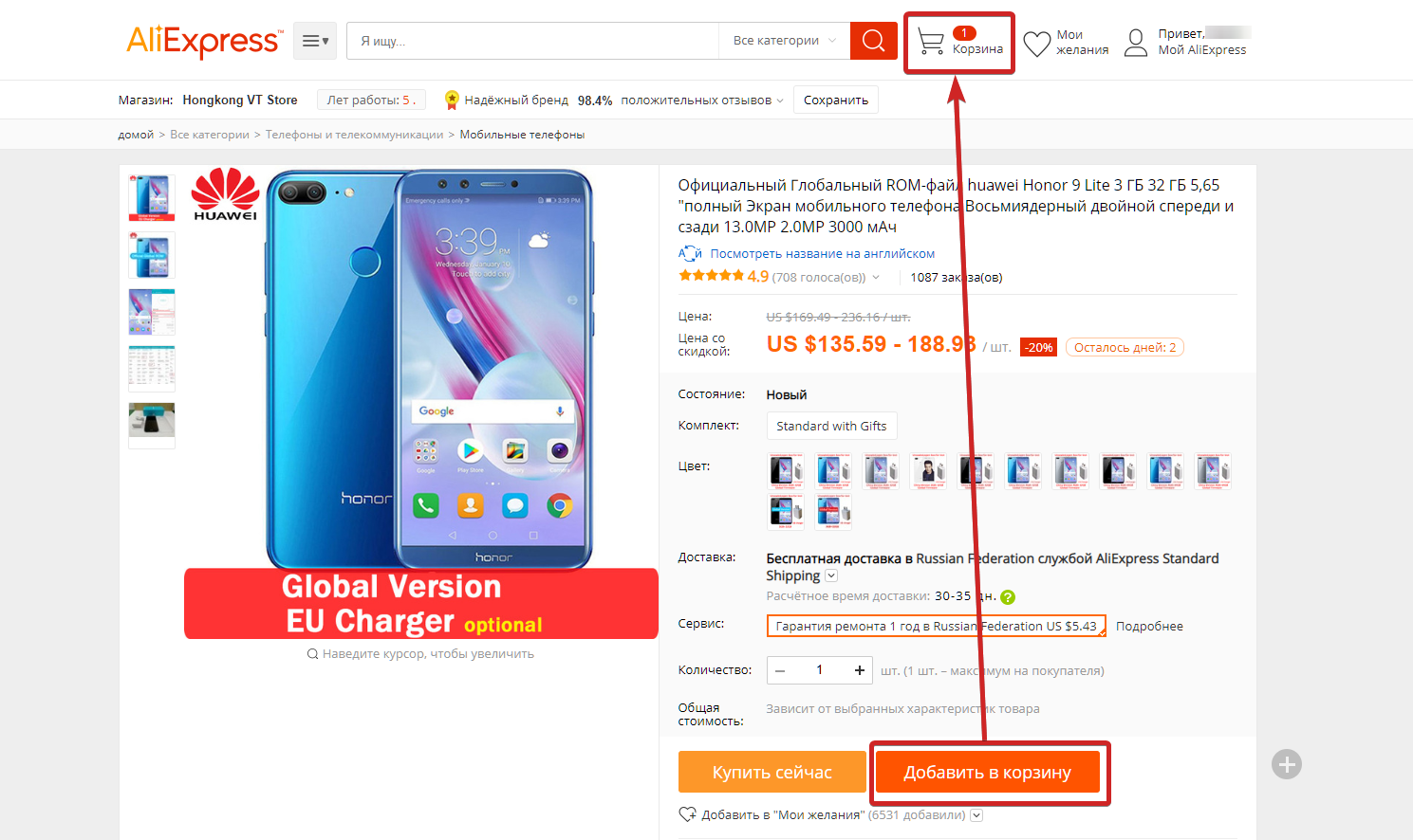 - Выбор конкретного товара на Aliexpress и формирование покупки, отмечая для каждой позиции все необходимые параметры.