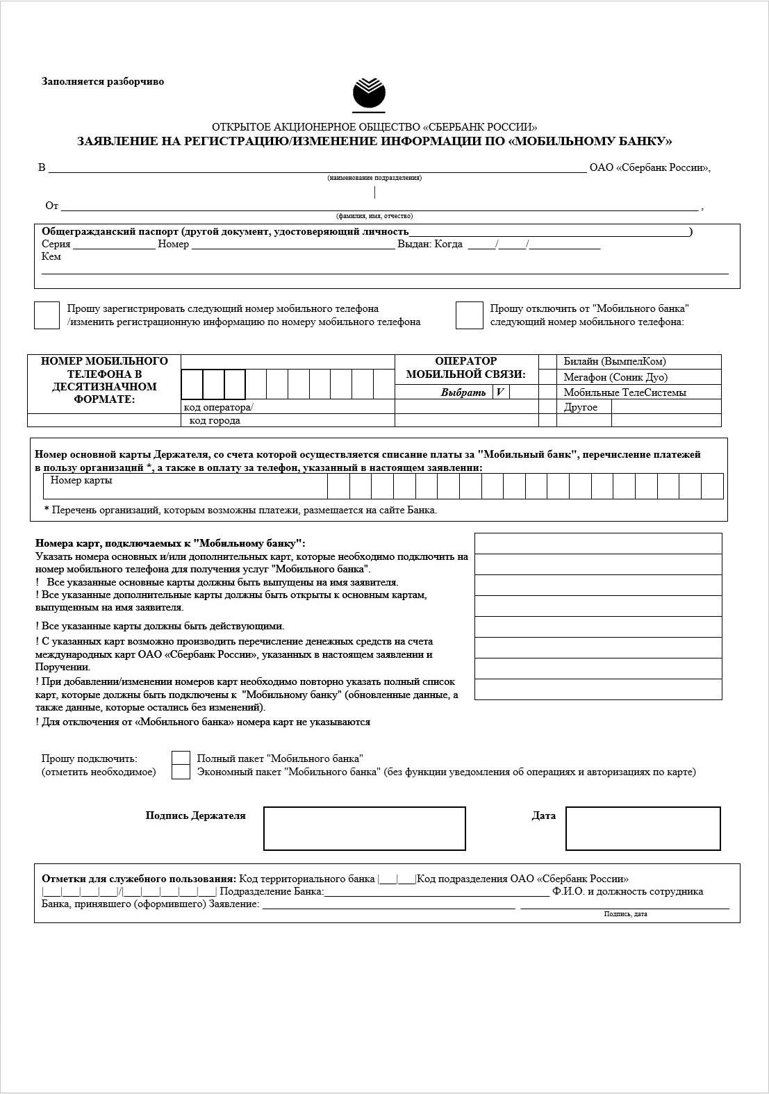 Заявление заполняется по установленной форме. Она же предусмотрена и для изменения телефона, привязанного к карте.