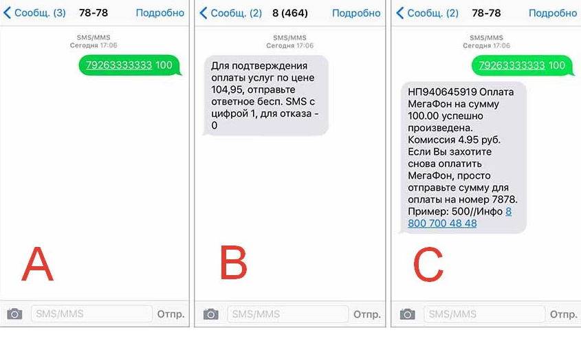 Еще один, не менее простой способ, как можно перевести деньги с Билайна на Мегафон – при помощи смс-команд. Для перевода средств необходимо отправить смс с текстом 7номер_абонента сумма, на номер 7878. То есть, выглядеть смс будет так: 792412345678 100. Где номер абонента должен обязательно начинаться с цифры 7, цифра 100 – это сумма перевода, а между номером и суммой — пробел. В случае успешного либо не успешного завершения операции, вы будете оповещены смс-уведомлением.