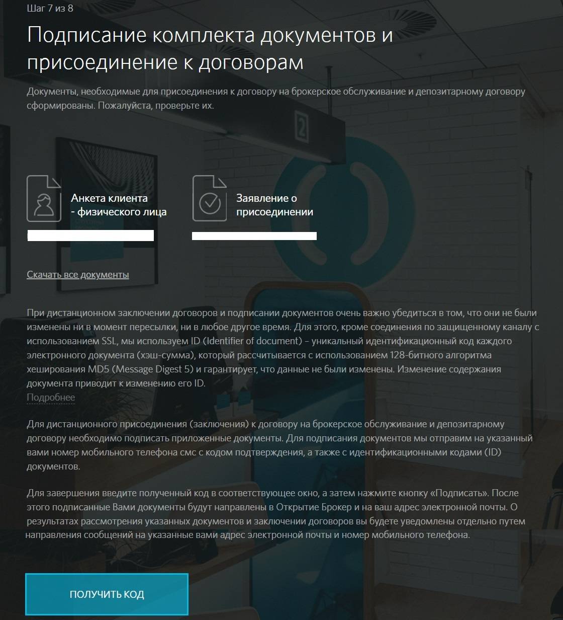 Перед этим документы скачивают и подтверждают свое согласие, нажав на клавишу получения кода. Когда пароль введен в соответствующее окошко, нажимают на кнопку «подписать».