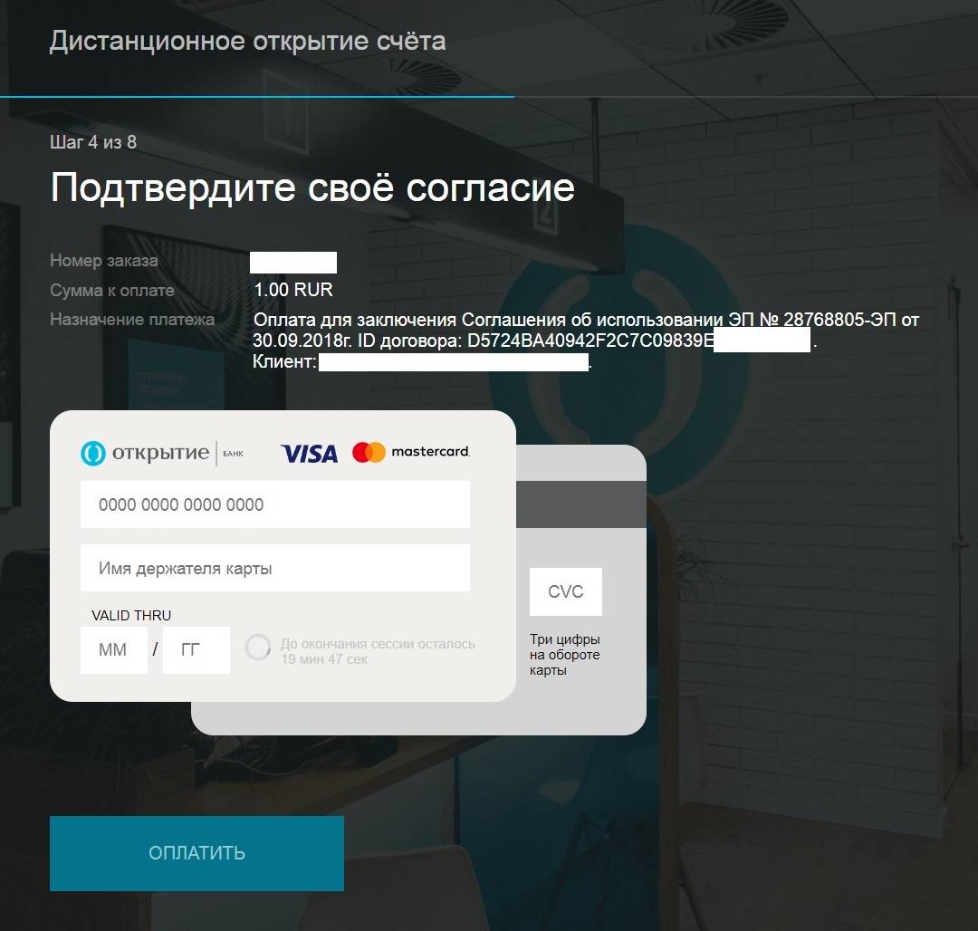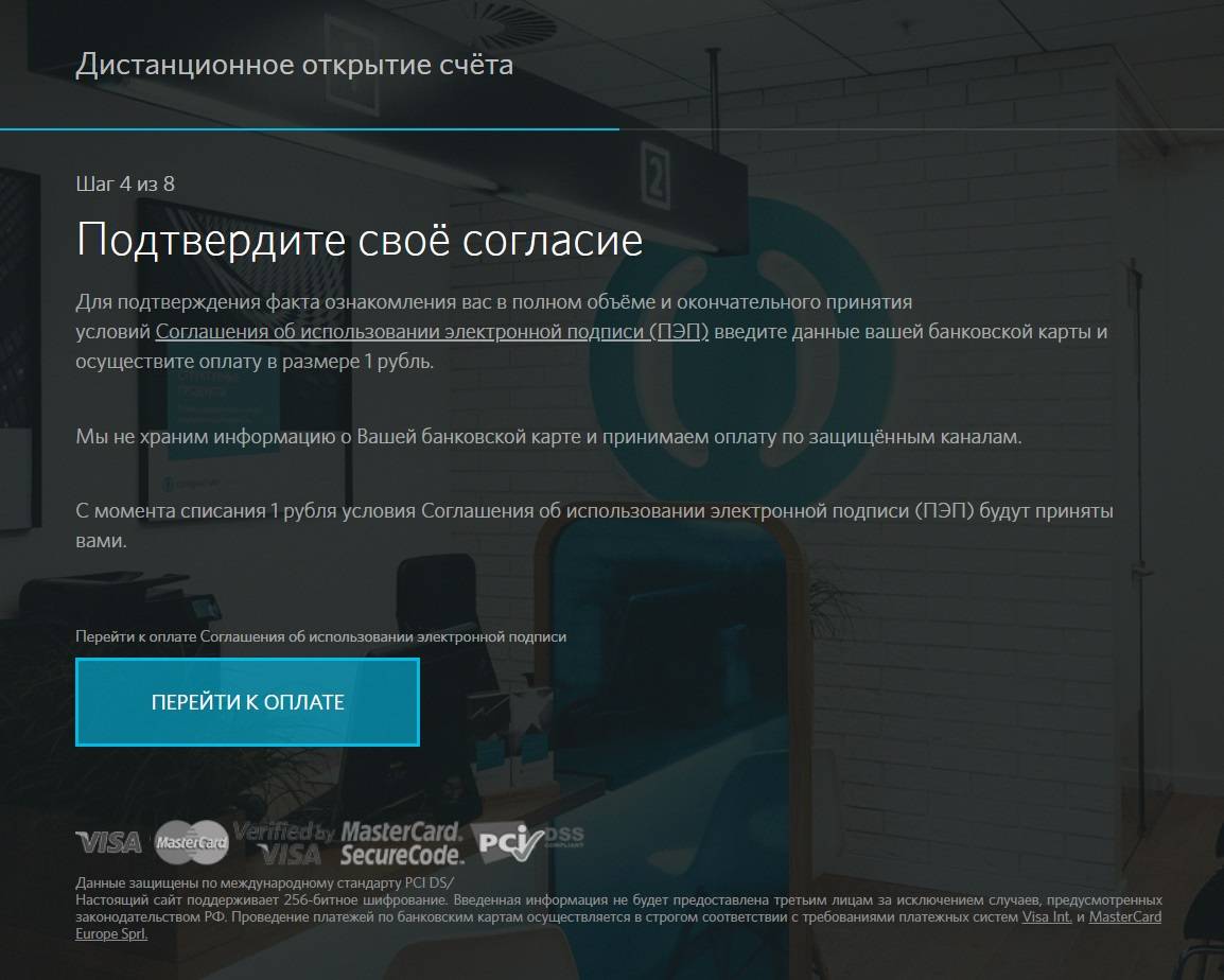 Теперь предстоит передать согласие на использование ПЭП (электронной подписи) путем списания с банковской карточки 1 рубль. Клиент нажимает на кнопку «перейти к оплате» и заполняет реквизиты карточки для списания.