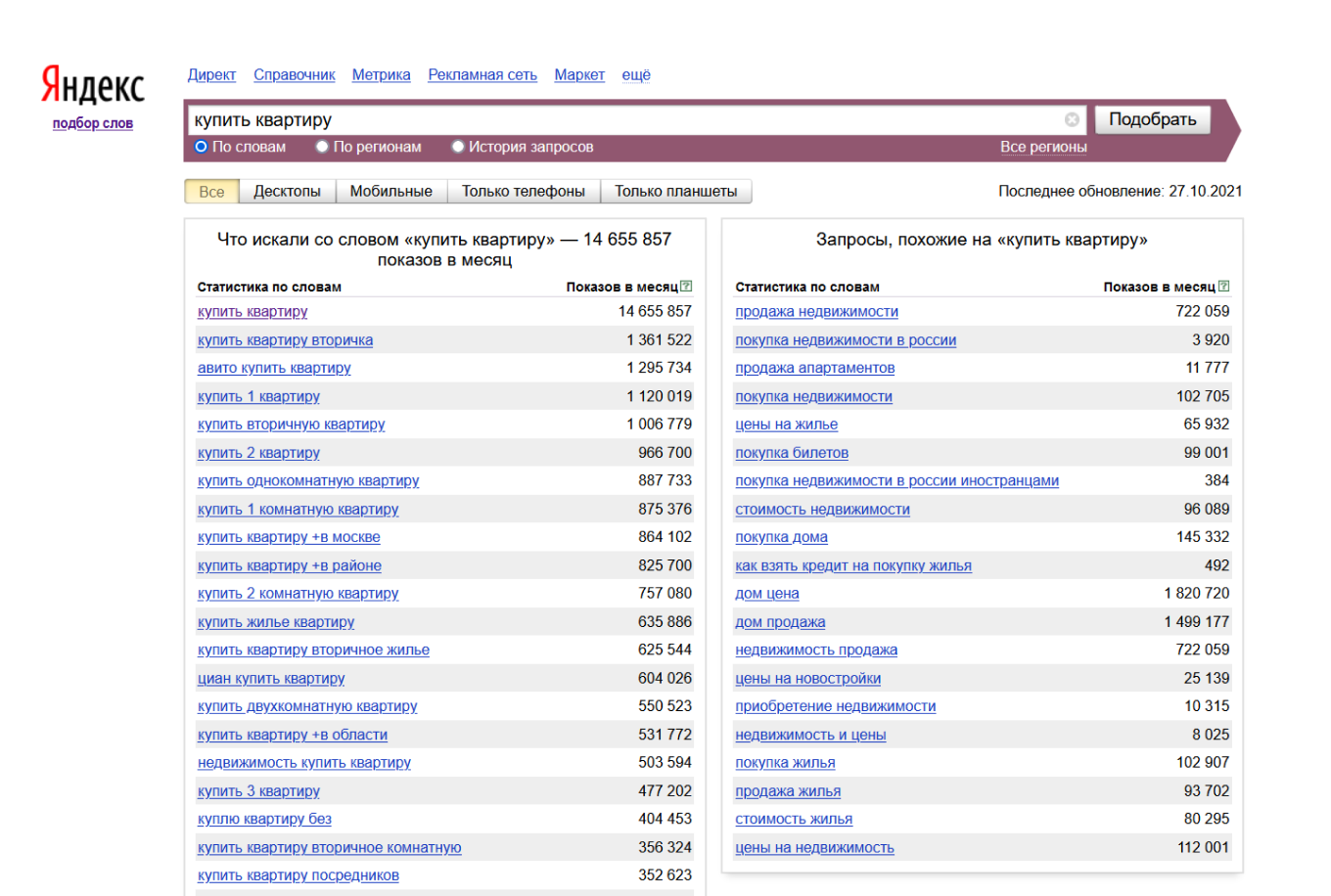 Например, вы создаете сайт по продаже недвижимости. Вводим в Вордстат запрос «купить квартиру» и видим, что пользователи ищут квартиры по определенным параметрам: по количеству комнат, по расположению, вторичное это жилье или новостройка. Значит, нужно будет создать такие страницы на сайте или использовать в фильтрах в настройках поиска объектов на сайте