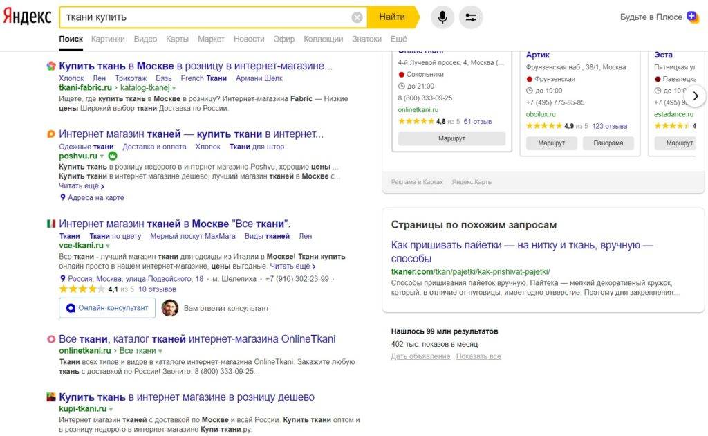 посмотрим поисковую выдачу по запросу «ткани купить». Прокрутив рекламные