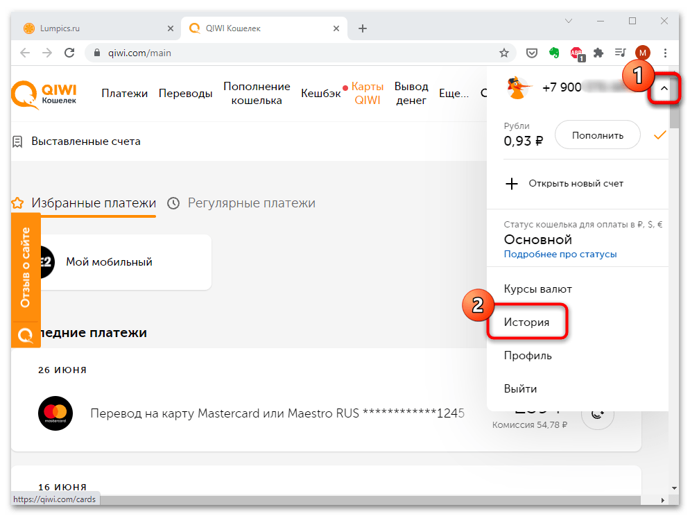 - Проверить платеж через раздел «История». Если там он не значится, перейти к следующим шагам. Если платеж найден, ожидать поступления средств.