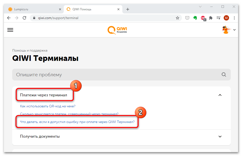 Раскройте блок «Платежи через терминал», затем выберите пункт «Что делать, если я допустил ошибку при оплате через QIWI Терминал?».