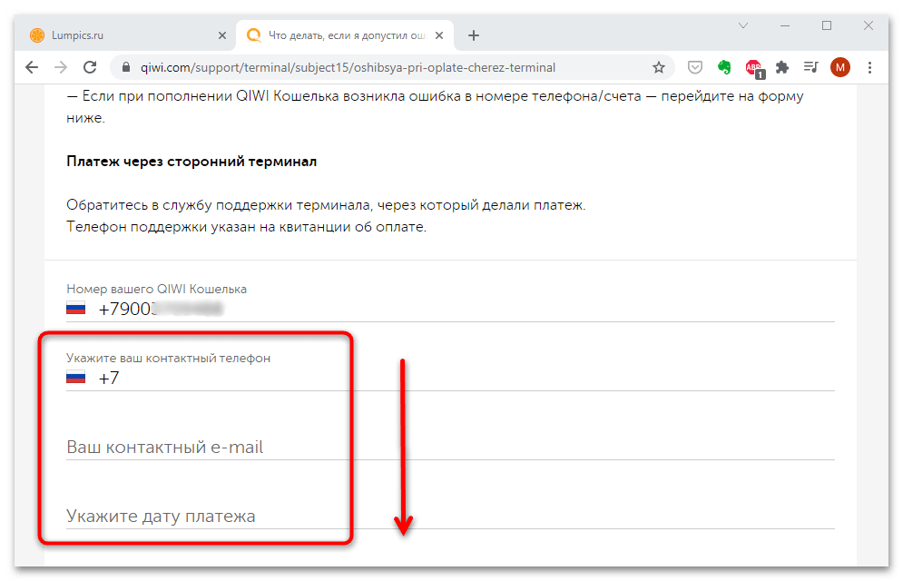 Если при использовании терминала QIWI была допущена ошибка во время перевода средств, то на сайте платежной системы потребуется заполнить специальную форму:
