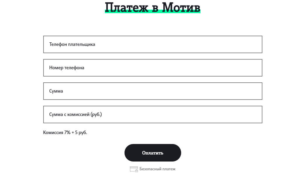 Перечисление денег в МОТИВ.Pay сопровождается снятием комиссии в размере 5-6% от суммы. На величину комиссии и условия проведения влияет выбранный клиентом тарифный план. Поэтому перед совершением операции рекомендовано ознакомиться с соответствующими положениями подписанного сторонами договора.