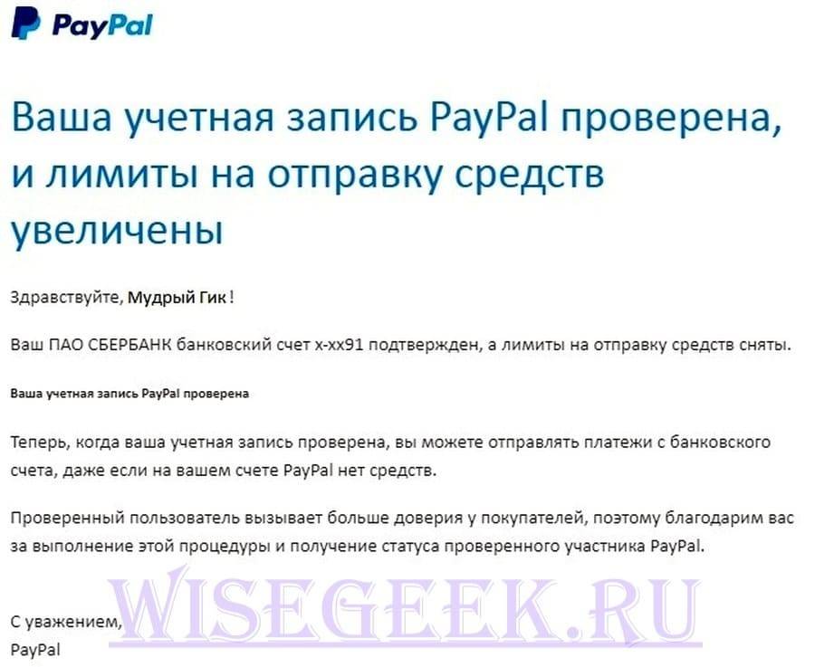6. Если Вы всё сделали верно, то на вашу почту должно прийти сообщение как на скриншоте ниже. Также у Вашего счёта Сбербанка в ПейПеле исчезнет надпись “Готов к подтверждению”.