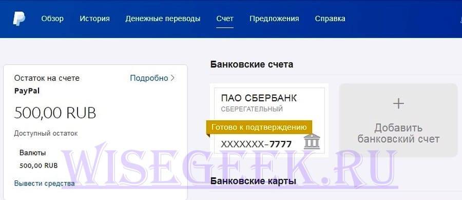 И так, как вывести деньги с пайпал на карту Сбербанка? После того, как на вашу карту поступили платежи, откройте сайт PayPal, перейдите во вкладку «Счет» и найдите счет, который вы недавно добавили. Он будет помечен ярлыком «Ожидает подтверждения». Нажмите на него.