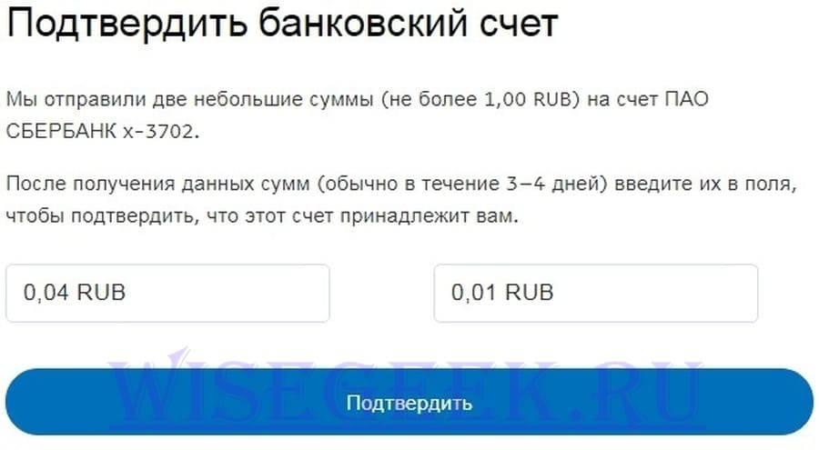 1. После добавления банковского счета, Вам в течение 3-4 дней придёт 2 небольших суммы. Иногда перевод происходит на следующий день.