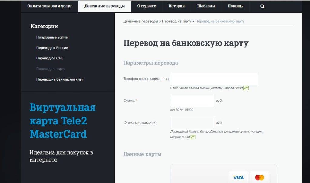 сайте оператора Теле 2 также можно перевести деньги на карту Сбербанка. Для этого необходимо зайти на сайт с телефона или компьютера. Найти меню денежные переводы. А затем перевод на карту откроется новое окно, где необходимо ввести все данные: