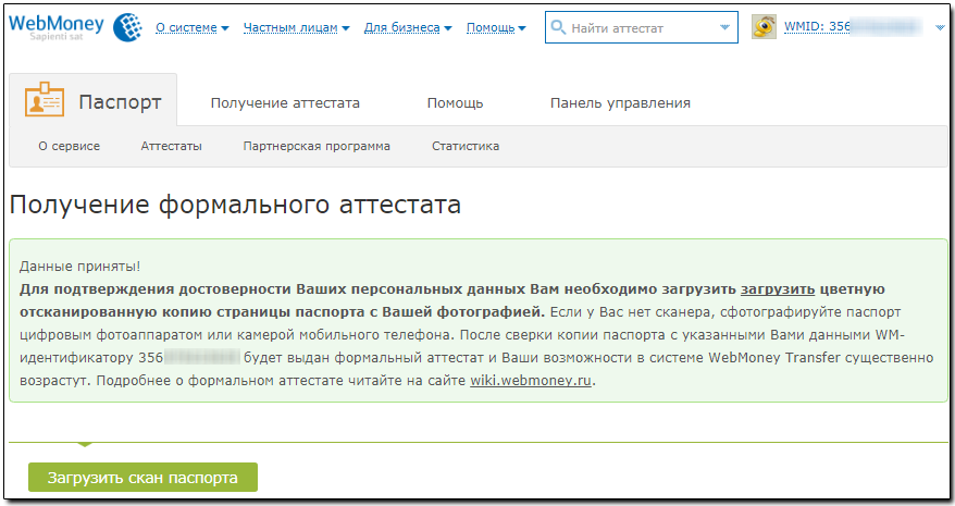 На этой процедура ввода данных завершена, проверка займет несколько рабочих дней. Затем при входе на главную страницу своего Вебмани кошелька владелец увидит надпись «Формальный статус», а также ему придет письмо об успешном прохождении идентификации.