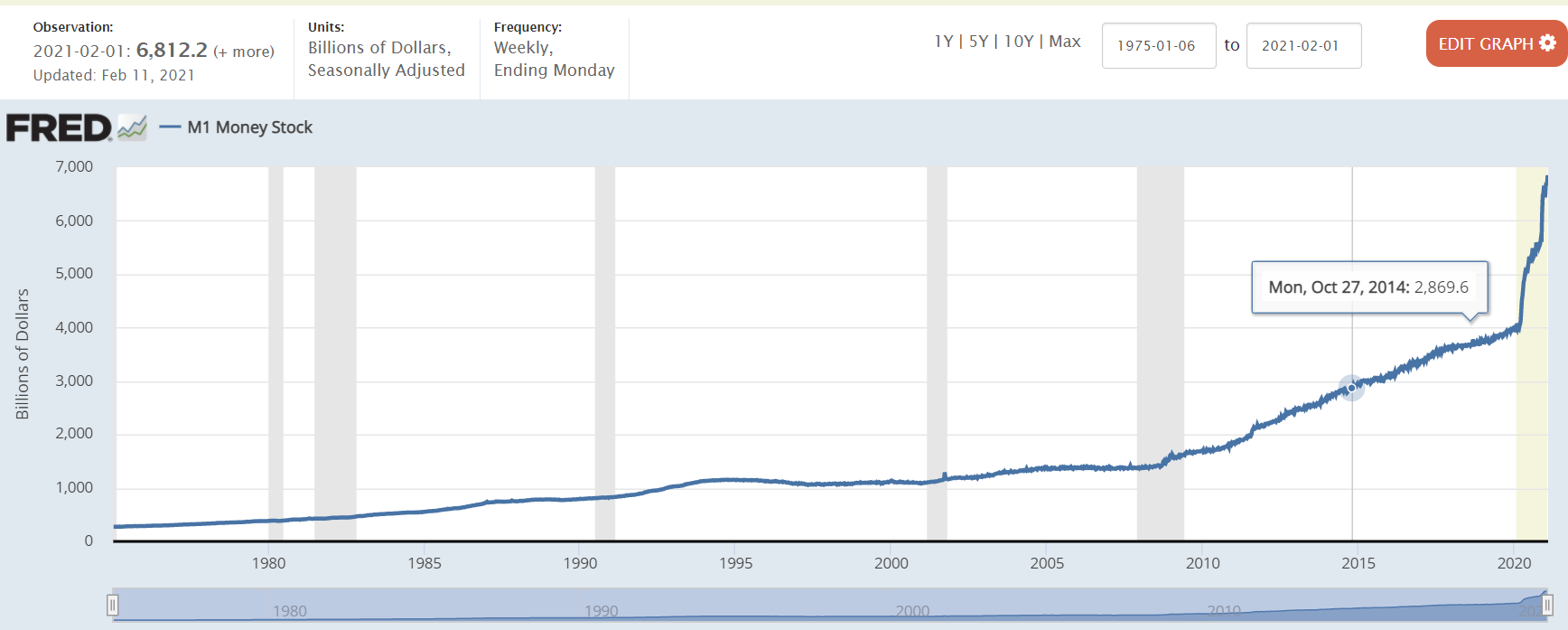 Если посмотреть на график денежной наличности, то США в 2020 году напечатало наибольшее количество денег(вы можете найти этого график по запросу FRED M1)