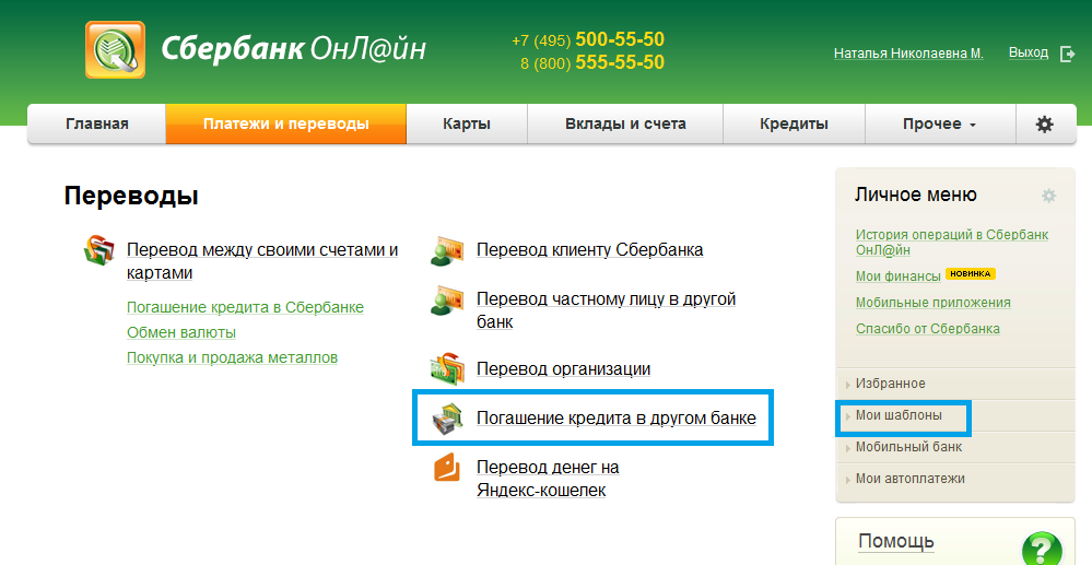 Переводить деньги на счет банка Хоум Кредит можно с кредитной карты любого банка. Рассмотрим перевод на примере Сбербанка. Используя все ту же удобную опцию «Интернет-банк», только теперь от Сбербанка, переходим на вкладку «Платежи и переводы», на которой выбираем «Погашение кредита в другом банке». Заполнить все реквизиты придется всего один раз, далее платеж можно сохранить в Шаблонах.