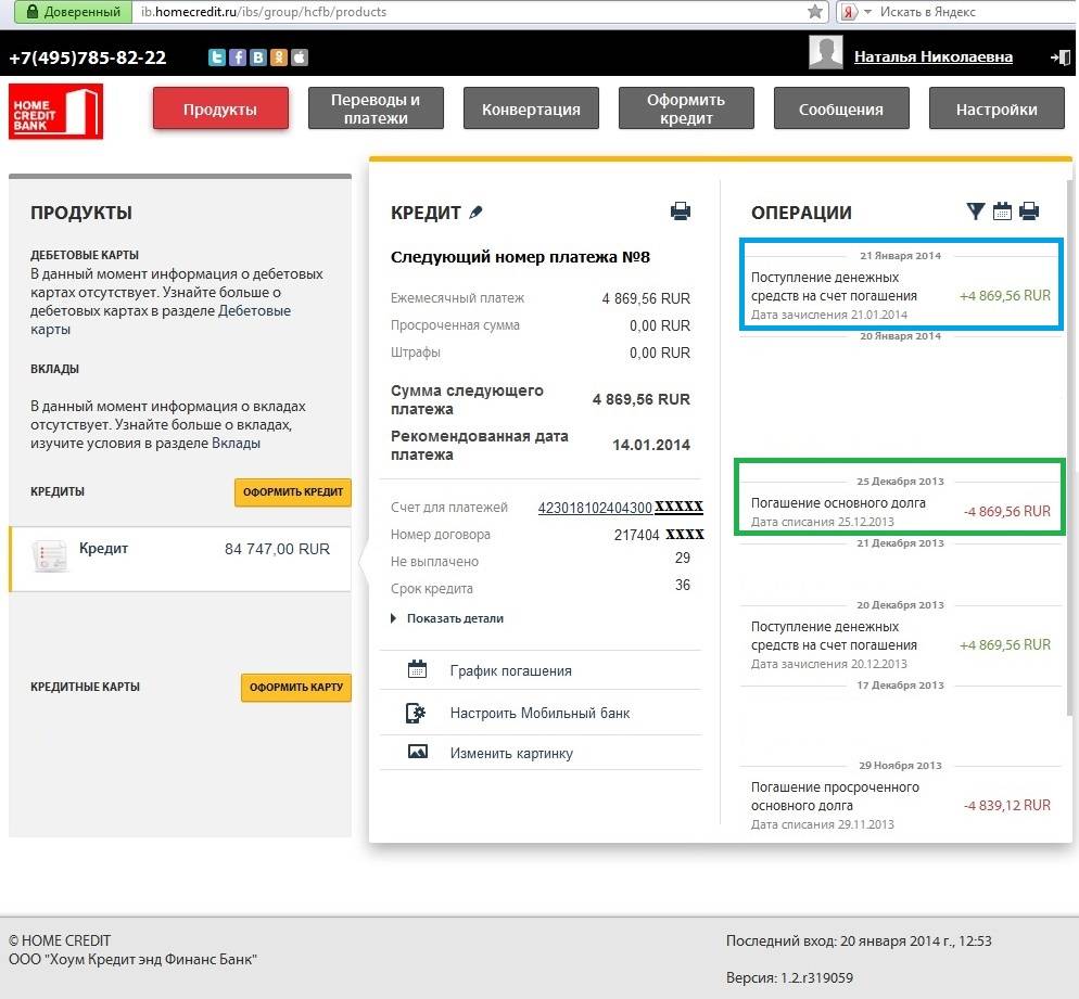 Также поступление денежных средств можно увидеть на главной странице Интернет-банка Хоум Кредит.