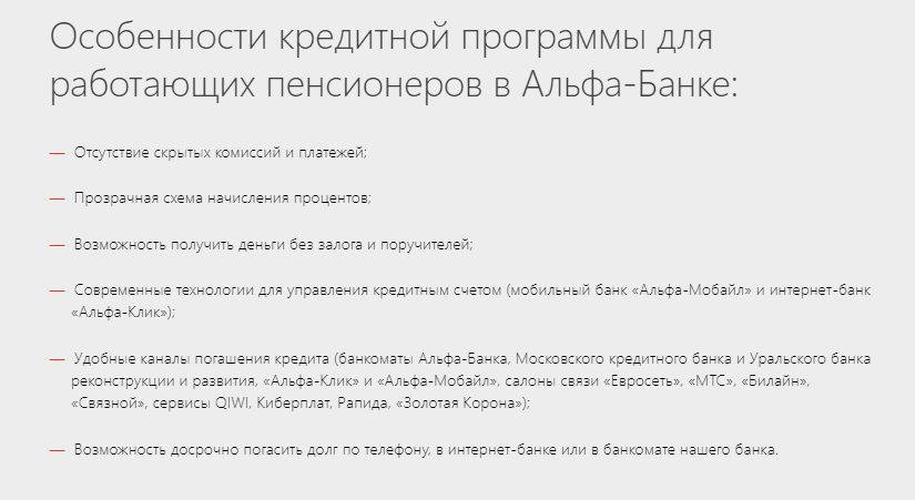 Ниже указаны стандартные условия по кредиту для пенсионеров в Альфа-Банке: