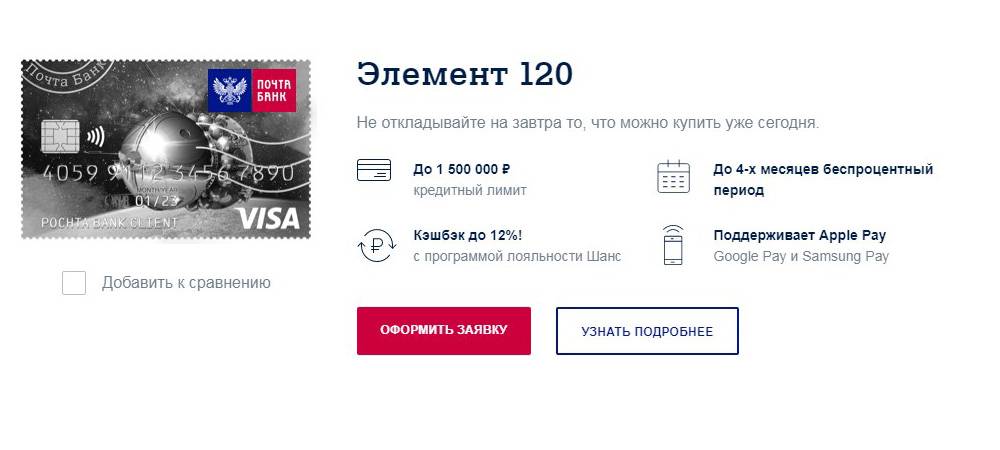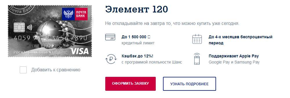 Для получения карты «Элемент 120» от «Почта Банка», клиенту следует соответствовать следующим требованиям: