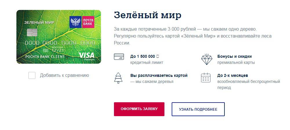 Если же из кредитных карточек «Почта Банка» вы выбрали предложение «Зеленый мир», необходимо понимать, что требования к заемщику при оформлении такой карты выглядят следующим образом: