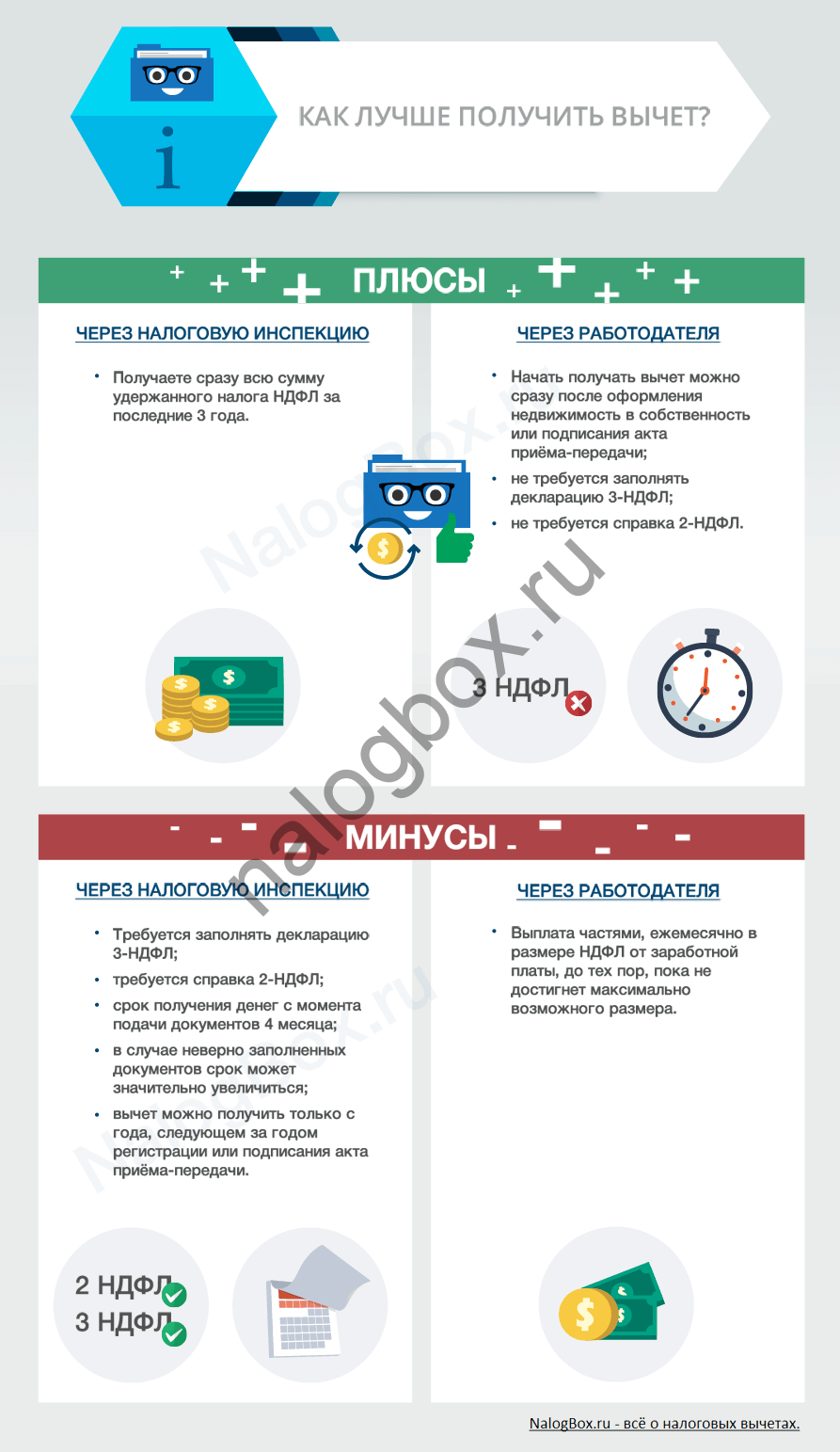 Оформление налогового вычета у работодателя обладает как плюсами, так и минусами. И только вам решать, какой способ возврата выбрать: