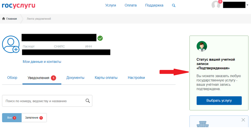 - Проверить запись. При входе в личный кабинет с правой стороны всплывает окно о статусе профиля.