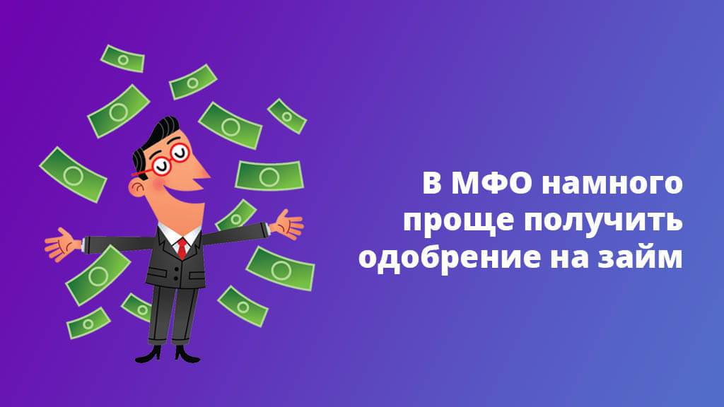 Какие есть плюсы у обращения в такие компании? Они небольшие, к ним не так много требований со стороны закона, они не несут крупных затрат, а значит, могут лояльно относиться к своим потенциальным клиентам. Очень многие люди, получившие отказ в банке, могут рассчитывать на одобрение в МФО.