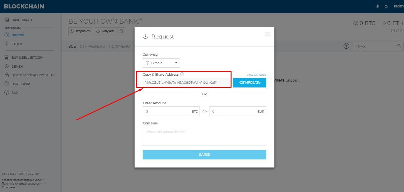 - Далее копируете адрес, на который вы хотите получить биткойн.