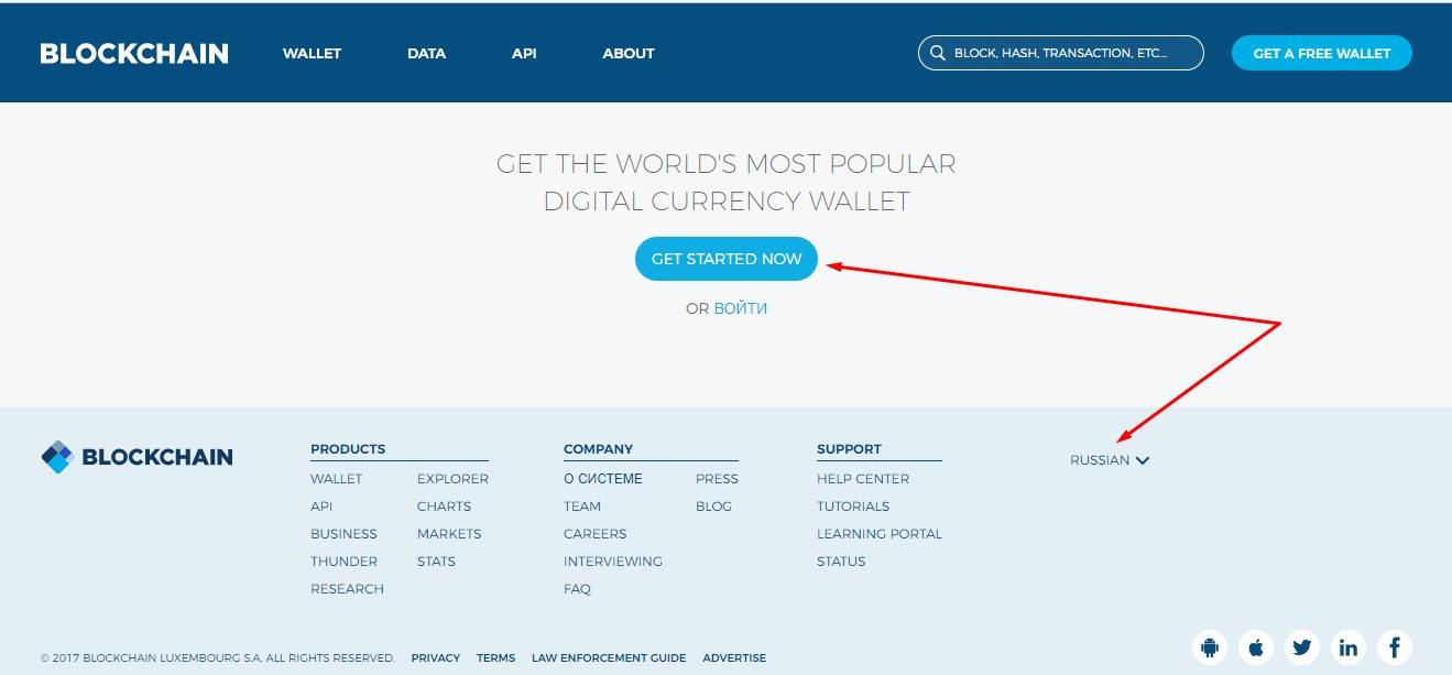 Шаг № 1. Старт можно осуществить с главной страницы сайта, при этом не должно пугать, что частично меню не переведено на русский язык. При выборе русского языка в подвале страницы и при нажатии на кнопку старта в дальнейшем вы будете использовать биткоин кошелек на русском.