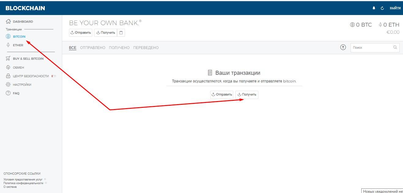 Дополнительно желательно в том же подпункте меню«Безопасность» пройти двухшаговую верификацию, оставив свой номер телефона. Если вам в этот момент нужно как-то узнать адрес биткоин кошелька, который вы обнародуете для получения средств, то откройте основное меню транзакций и нажмите кнопку «Получить».