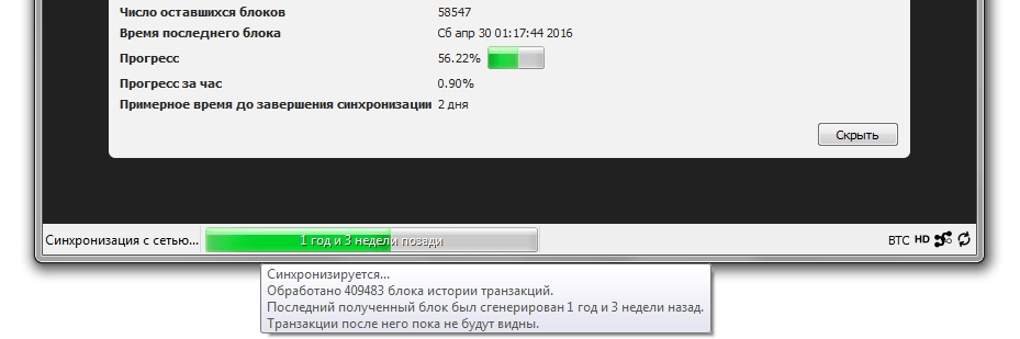 Сразу после запуска кошелька начнется его синхронизация. Занять этот процесс может от 2-х часов до нескольких дней. На скорость синхронизации влияет несколько факторов: