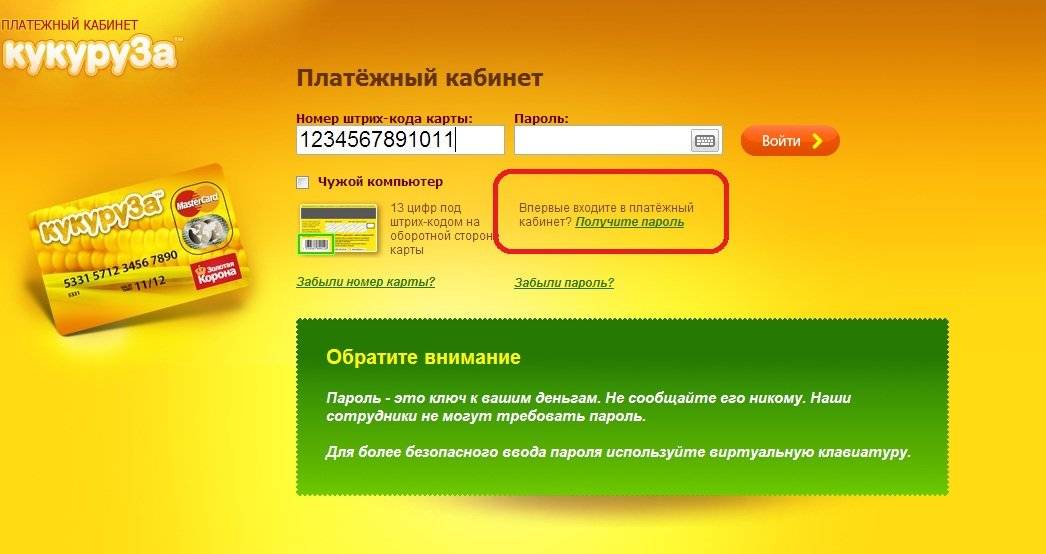 Для входа понадобится ввод номера штрих-кода, расположенного на оборотной стороне пластика. Для пополнения потребуется привязка банковской карты, с которой будут списываться средства. “Кукуруза” при этом комиссию не берет. Вознаграждение может брать банк, с карты которого производится перечисление. Информацию о размере комиссионного сбора необходимо узнавать в банке-эмитенте, либо на его официальном сайте в разделе “Переводы” или “Тарифы”.