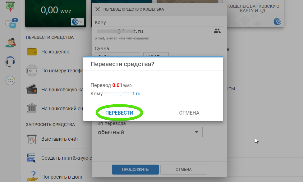 - путём перевода средств с кошелька Webmoney на другой бумажник этой же ПС.