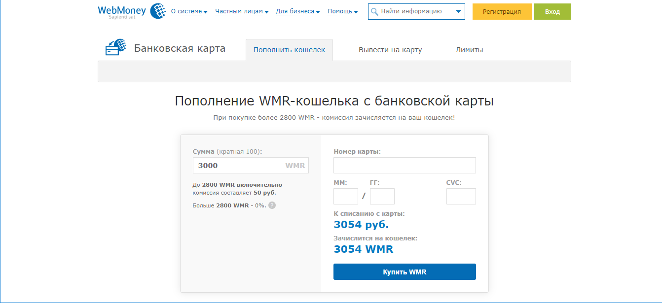 Если карта оснащена технологией 3D-Secure, транзакция подтверждается проверочным СМС-кодом. Минимальная сумма зачисления — 10 рублей. Деньги на кошелек поступают мгновенно. Комиссия в при пополнении кошельков WMP — 2,09% от суммы операции.