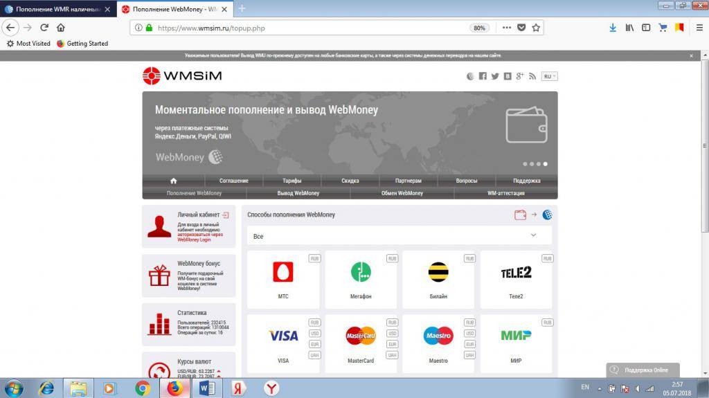 Также в Интернете существует множество сторонних сервисов (WMSim, WM-SMS, RURU), которые предлагают услуги по пополнению баланса кошелька посредством отправки SMS. Схема действий следующая: необходимо выбрать оператора, указать номер портфеля и сумму пополнения. Недостатком использования этих ресурсов является повышенная комиссия, которая может составлять до 50% от суммы перевода.