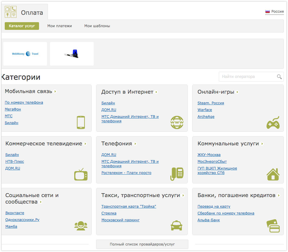 После авторизации на сайте необходимо выбрать раздел «Оплата услуг». На экране отобразиться полный список доступных мобильных операторов. Остается только выбрать нужного.